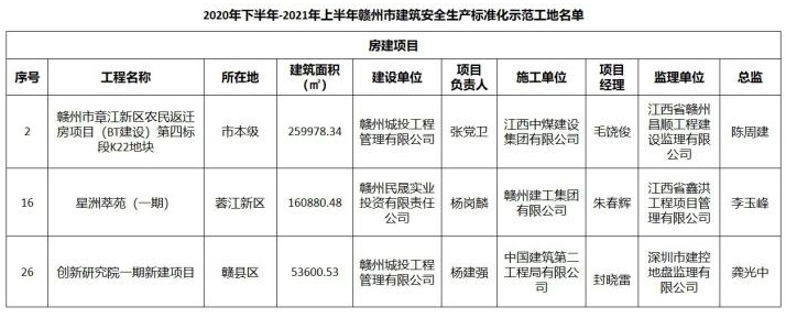 日前,贛州市住房和城鄉(xiāng)建設(shè)局公布了2020年下半年-2021年上半年贛州市建筑安全生產(chǎn)標(biāo)準(zhǔn)化示范工地名單,由贛州城投集團(tuán)建設(shè)的贛州市章江新區(qū)農(nóng)民返遷房項(xiàng)目(BT建設(shè))第四標(biāo)段K22地塊、星洲萃苑(一期)、中科院贛江創(chuàng)新研究院一期新建項(xiàng)目共3個(gè)項(xiàng)目獲獎(jiǎng)。