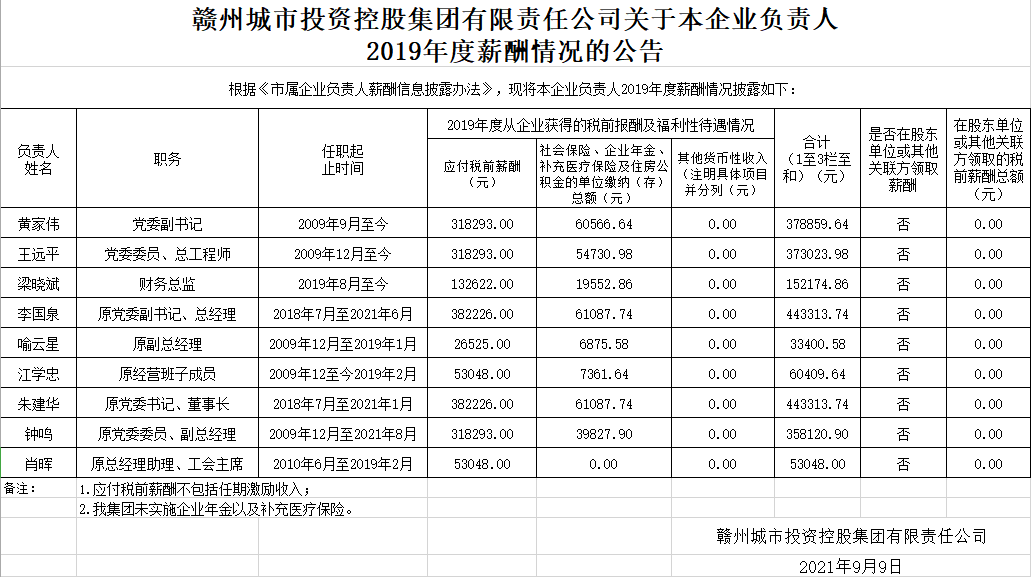 贛州城市投資控股集團有限責(zé)任公司關(guān)于本企業(yè)負責(zé)人2019年度薪酬情況的公告