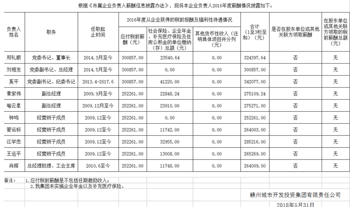 贛州城市開發(fā)投資集團(tuán)有限責(zé)任公司關(guān)于本企業(yè)負(fù)責(zé)人2016年度薪酬情況的公告