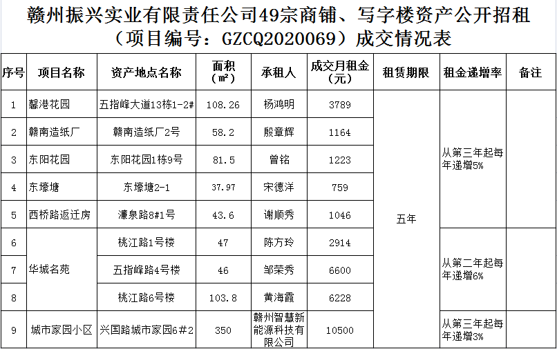 2020年10月27日上午10時(shí),在贛州市公共資源交易中心舉行的贛州振興實(shí)業(yè)有限責(zé)任公司49宗商鋪、寫字樓資產(chǎn)公開招租(項(xiàng)目編號(hào):GZCQ2020069),現(xiàn)將公開招租成交情況公示如下: