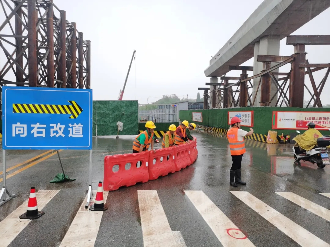 交通安全維護是項目施工的重中之重。為在確保施工安全和進度的前提下,最大限度減少項目建設對交通的影響,贛州城投集團項目部工作人員迅速行動,召集施工、監(jiān)理等單位討論編制創(chuàng)業(yè)路橋梁上跨崗邊大道的交通導行方案。為保證交通導行方案的可行性,項目部邀請交警部門、龍泉村村民到現(xiàn)場踏勘,聽取意見、建議,并對方案進一步優(yōu)化、完善。經(jīng)交警部門審批方案通過后,項目部集中力量抓住4月10日和11日周末兩天的空檔期,加班加點完成了跨崗邊大道區(qū)域的交通導行及圍擋,并在后續(xù)施工中安排了專人對車輛、行人進行引導,對隱患及時排查整改,派駐安全引導員在學生上下課時間點到路口對通行車輛、行人進行引導,護航創(chuàng)業(yè)路三標上跨崗邊大道橋梁施工階段的原有地面道路社會車輛及行人有序通行。