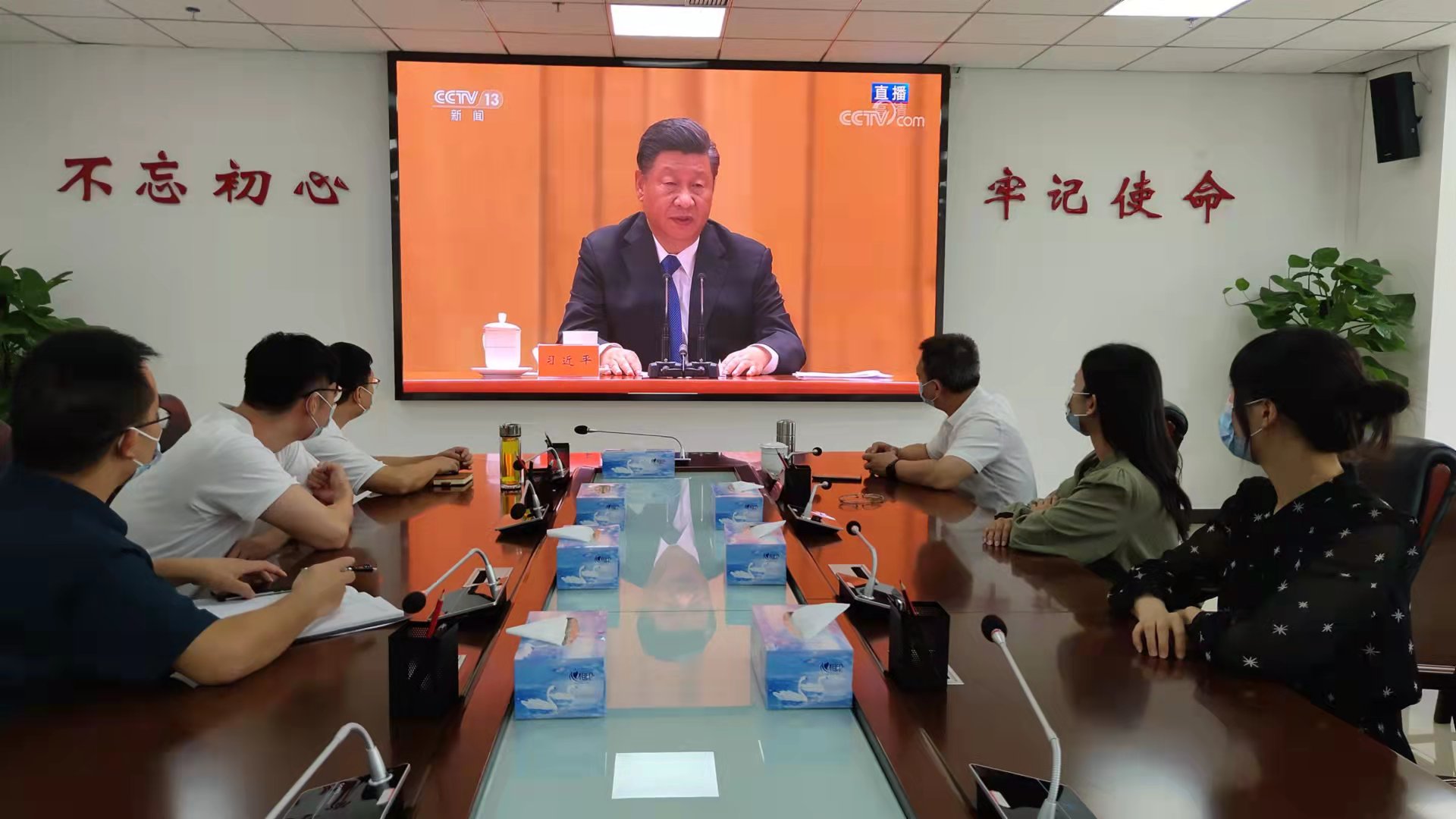 跟著直播大會(huì)現(xiàn)場(chǎng)的節(jié)奏,大家起立、肅穆,共同奏唱了國(guó)歌,認(rèn)真聆聽了習(xí)近平總書記在大會(huì)上發(fā)表的重要講話精神。