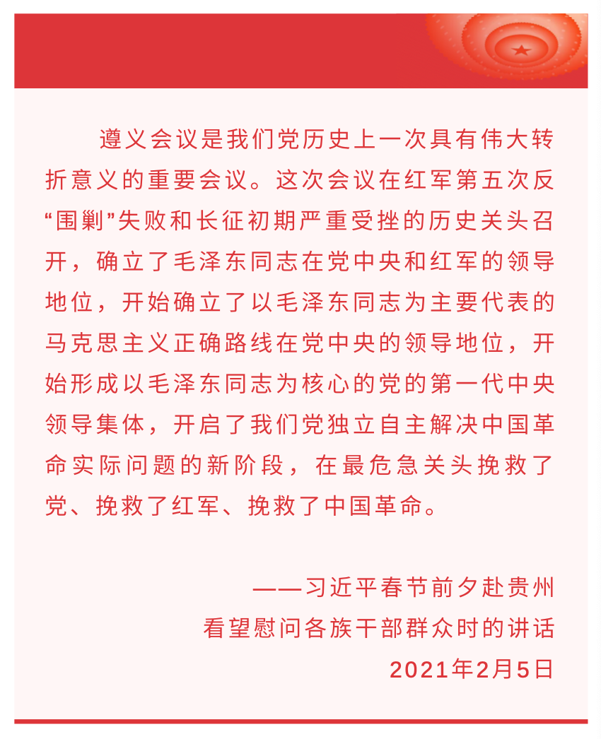 遵義會議是黨的歷史上一個生死攸關(guān)的轉(zhuǎn)折點。遵義會議后,中央紅軍在毛澤東等指揮下,根據(jù)實際情況的變化,靈活變換作戰(zhàn)方向,迂回穿插于敵人重兵之間,于5月上旬渡過金沙江。至此,中央紅軍擺脫幾十萬國民黨軍隊的圍追堵截,粉碎了蔣介石圍殲紅軍于川黔滇邊境的計劃,取得了戰(zhàn)略轉(zhuǎn)移中具有決定意義的勝利。